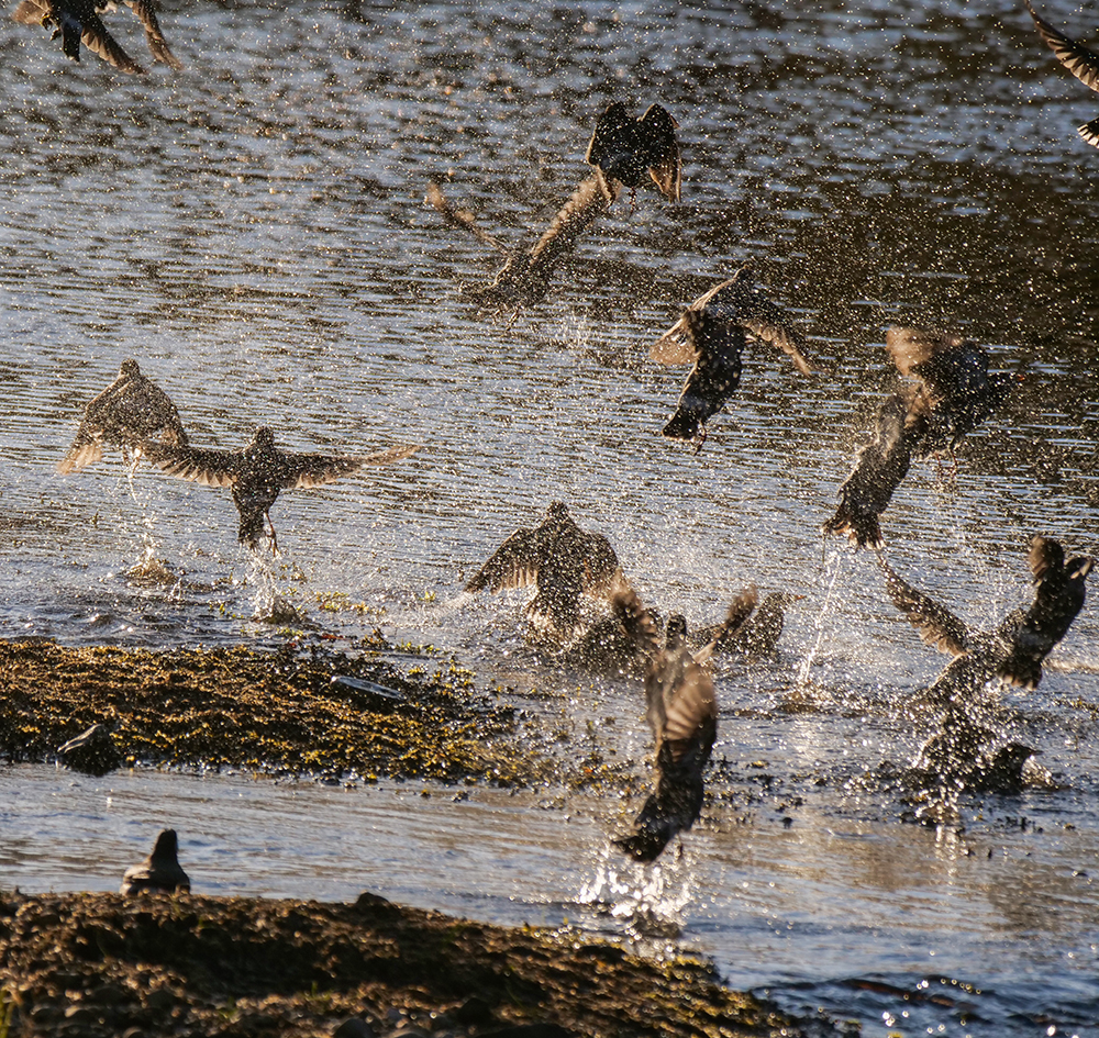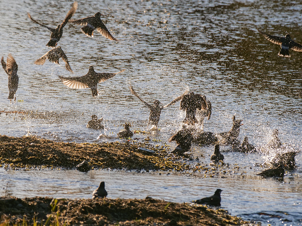 黒目川の浅瀬でムクドリたちが水浴びをしていました。遊歩道から近い場所だったので、人が通ると逃げてしまうだろうなと思いながら、カメラを構えていました。だんだん人が近づいてきて、ムクドリの水浴びに気づいて立ち止まりました。その瞬間、ムクドリたちはいっせいに飛び立ちました。