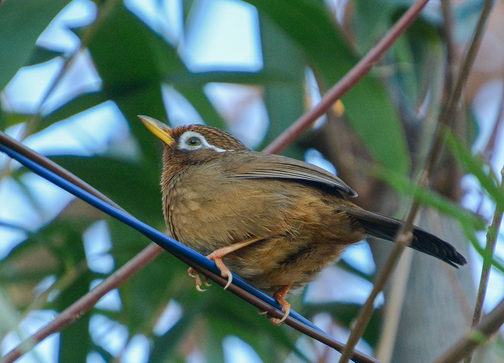 藪の中からガビチョウ(画眉鳥)の鳴き声がしたので、表に出てきてくれることを期待して、しばらく待ってみました。すると、藪の中を通っている電線にとまってくれました。はじめはこちらを向いていましたが、人がいるのに気づいて体を反転。さっさと飛び去っていきました。